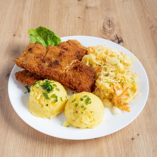 Filet z kurczaka panierowany, ziemniaki, surówki
